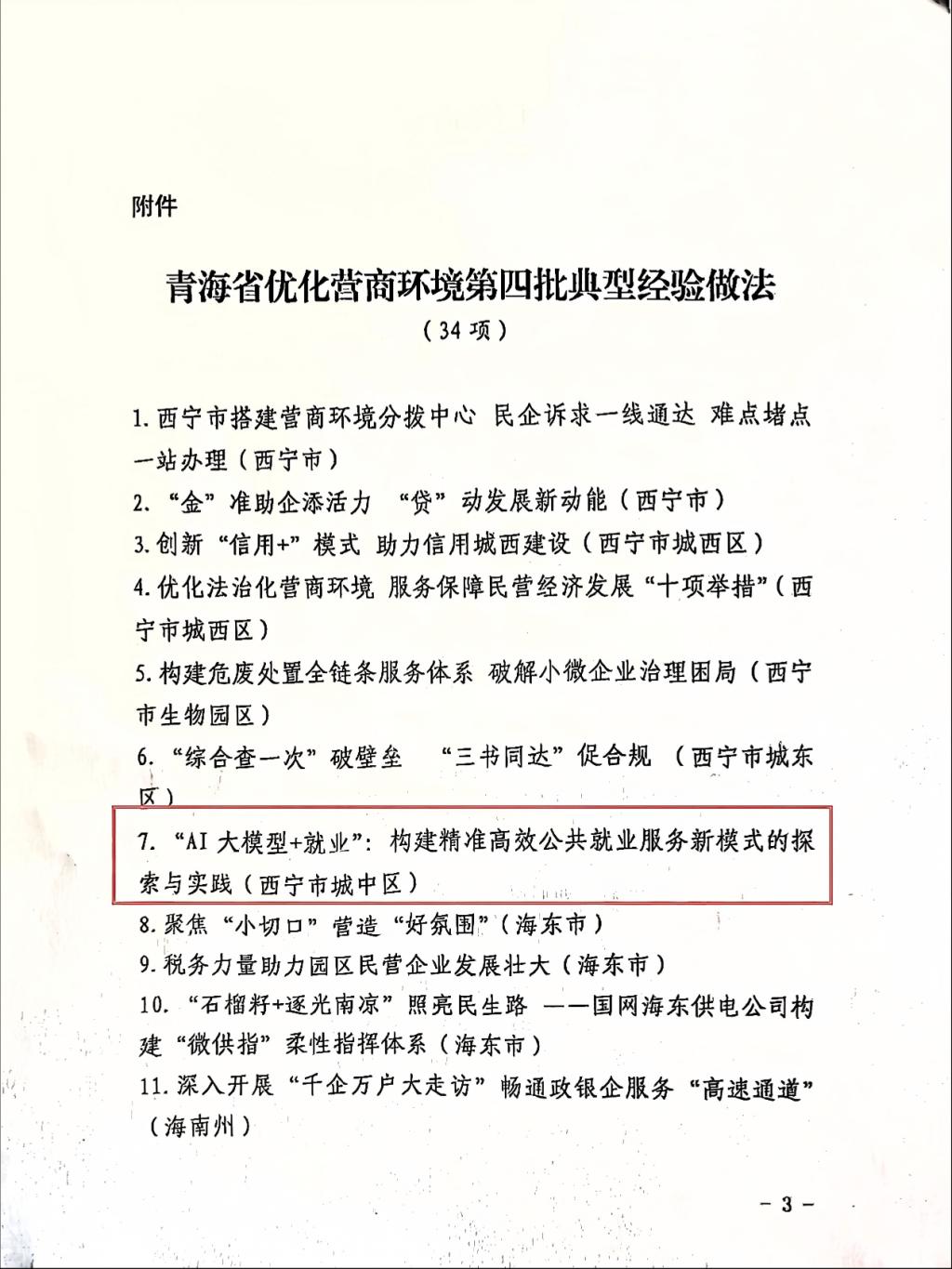 “AI大模型+智慧就业”:构建精准高效公共就业服务新模式。聚焦就业服务覆盖半径不足、跨部门协同效率较低、岗位供需匹配精准度不高等痛点,立足“数智零工驿站”等数字化基础,于2025年启动“全周期智慧就业服务体系”建设项目,以AI大模型技术为核心,构建覆盖“岗位智能对接—职业能力提升—创业全周期辅导”的全链条智慧化服务生态,推动就业服务从“粗放供给”向“精准匹配”升级。创新打造“AI数字人直播带岗”服务模式,以“数字人”代替真人主播介绍岗位需求和解读政策,有效破解传统直播带岗面临的时空限制与人力成本高昂问题,进一步提升服务覆盖面和普及率,已开展AI直播带岗10场,服务企业234家,提供岗位735个,吸引11.9万人次观看,在线接收简历超1500份;开发“AI求职小助手”功能,链接“西宁招聘网”海量企业招聘信息,通过智能对话交互精准分析求职者能力和岗位要求匹配度,自动生成个性化推荐方案,显著缩短求职周期,提升匹配精准度,降低企业招聘成本与劳动者择业成本,已精准响应求职咨询1500余次,推荐就业1156人;在城中区大学生创业孵化基地公众号接入“AI创业导师”功能模块,整合导师资源与产业链服务,实时响应创业政策解答、导师指导、技术应用等多维度创业问题,以“一对一”智能陪跑破解创业服务供给碎片化难题,增强初创企业存活率,激发区域创新创业活力,目前已为企业提供创业指导服务644次,解答创业问题824个。