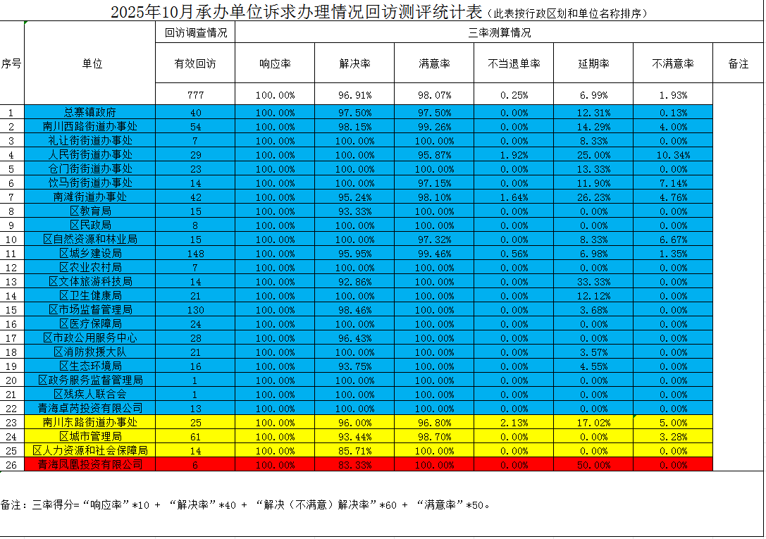 (二)诉求办理情况。10月份,各镇办位于蓝区的为:总寨镇政府、南川西路街道办事处、礼让街街道办事处、人民街街道办事处、仓门街街道办事处、饮马街街道办事处、南滩街道办事处。位于黄区的是南川东路街道办事处。