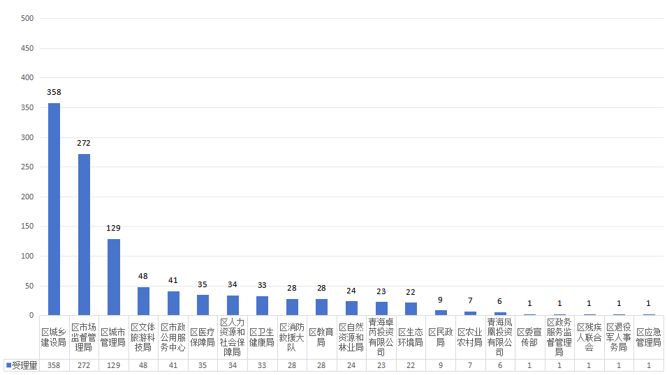 区政府各部门承接诉求工单1102件,占派单总量的71%。其中:区城乡建设局承接358件,占比33%,承接量第一;区市场监督管理局272件,占比25%,承接量第二;区城市管理局承接129件,占比12%,承接量第三。如图4: