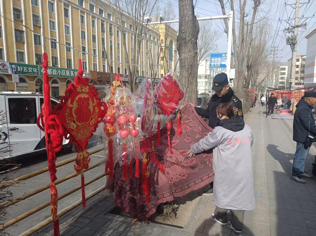 加强巡查服务,保障临时摊点规范运行。针对春联临时摊点的运营特点,区城市管理局建立了专项巡查机制,在重点时段增派人员加强值守,及时规范摊位摆放秩序,维护现场环境卫生。同时,执法人员在管理中注重服务引导,主动帮助经营者规范商品陈列,提醒保持消防通道畅通,耐心解答群众咨询。通过柔性管理与贴心服务相结合的方式,既确保了临时摊区规范有序运营,又营造了文明和谐的经营氛围,让春节便民摊点真正成为展现城市温度的一道风景线。