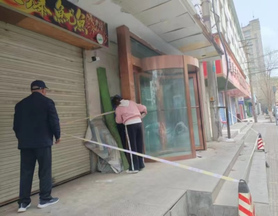 在专项排查过程中,执法人员发现大新街11号(原新天宾馆)门头底板存在漏水现象,该店长期停止营业,处于无人管理状态, 执法人员看到漏水现象便使用挑杆确定底板的稳固性和安全性,经查看发现底板有部分掉落的情况,存在一定的安全隐患,考虑到该店附近居住的老年人较多, 加上周边是大新街夜市晚上人流量大,执法人员第一时间组织人员拉起警戒线,防止居民路过该店门口时门板掉落造成意外;安排队员及时与该店负责人取得联系,告知相关隐患并要求尽快进行拆除。同时,在拆除现场执法人员对拆除作业进行指导并做好周边路过居民和车辆的安全维护工作。该店铺门头拆除结束后,执法人员及时通知辖区门头牌匾安装超过1年以上的所有商铺开展安全隐患排查工作,对存在安全隐患的门店要求其限期整改。