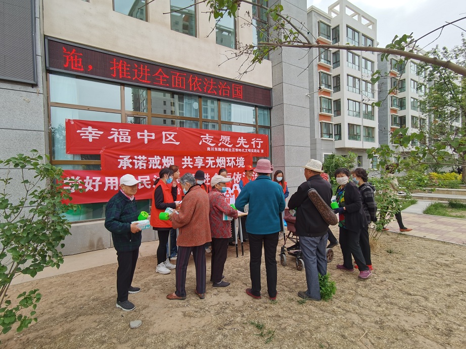 无烟日主题宣传。活动中志愿者们通过悬挂横幅、设立咨询台、发放宣传资料等方式向辖区群众宣传吸烟及二手烟的危害以及戒烟的好处,同时呼吁辖区居民不要在室内、公共场所、工作场所和交通工具内吸烟,营造良好的无烟环境,并在辖区餐饮店、超市等发放和张贴“禁烟标识”100余张。