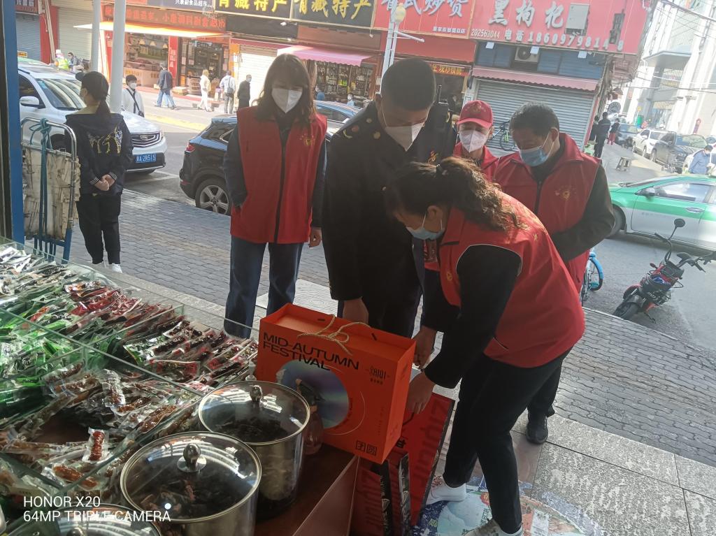 社区食品安全网格员对莫家街沿街超市、食杂店等进行了食品安全巡查和入户宣传,重点检查了与中秋节相关的食品,工作人员认真核对每一批次原材料进货记录、检查食品从业人员健康证、食品安全管理制度的落实情况。并严查是否存在使用回收或变质的馅料加工月饼、是否超范围超限量使用食品添加剂等行为,倡导商家良心生产,保证食品安全。
