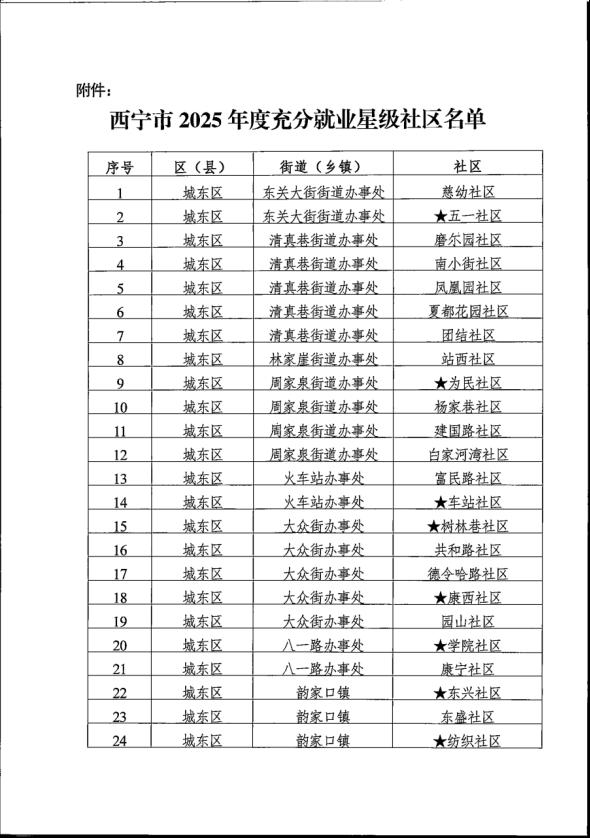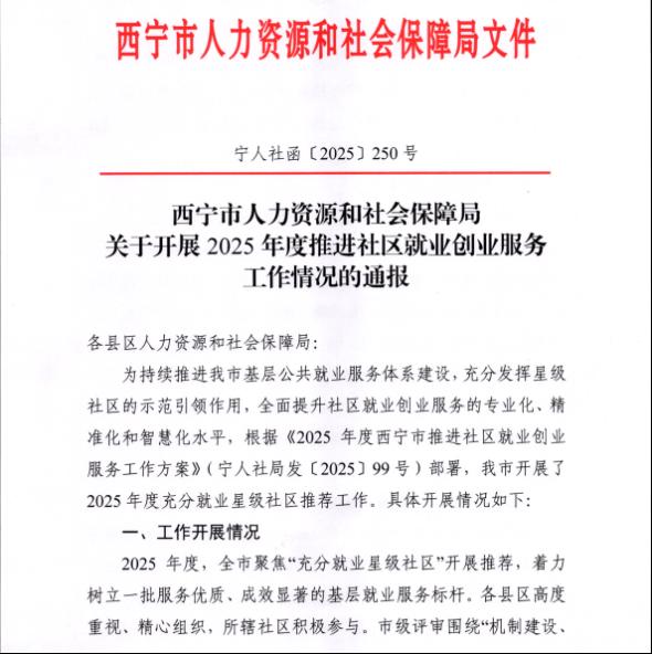 2025年,在全市推进社区就业创业服务工作中,我区16个社区被评为西宁市充分就业星级社区,占全市总数的21.3%,其中7个社区被评为绩效突出社区,占全市总数的23.3%。