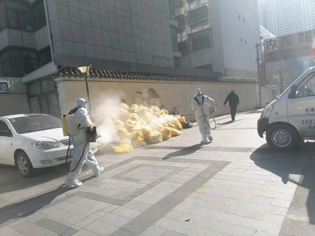 在此次疫情防控阻击战的关键时期,垃圾清运处置是关键一环,区域消杀灭源工作不得有半点马虎。根据区疫情防控指挥部的安排部署,连日来,城中区市政公用服务中心组织一线环卫职工全力投入到疫情防控工作中,奋战在疫情防控第一线。他们主动承担分配的工作任务,积极踊跃参与到任务最需要的地方去,他们不仅负责辖区日常的环境卫生保洁工作,还要对辖区公厕、垃圾中转站、生活垃圾清运车、果皮箱等区域进行全面消毒消杀。此刻,他们一个个由“环卫绿”化身为“大白”,身穿防护服、佩戴口罩、手套等防护用具,对辖区高风险区域、重点区域进行“地毯式”、全方位消杀,及时消除疫情传播风险隐患,切断病毒传播途径。虽然他们仅有口罩、手套、面罩、防护服等作为基本的防护措施,自身安全存在极大危险,但他们无怨无悔、任劳任怨,默默地坚守着自己最平凡的岗位,不论是清晨还是“凌晨”,穿梭在大街小巷的“环卫绿”,冒着感染病毒的风险,为辖区居民群众的正常生活提供保障,他们用自己的微薄力量换来了辖区居民群众的安心以及环境卫生的整洁,用实际行动彰显一线环卫职工的担当,以无私奉献确保疫情防控措施落地见效。