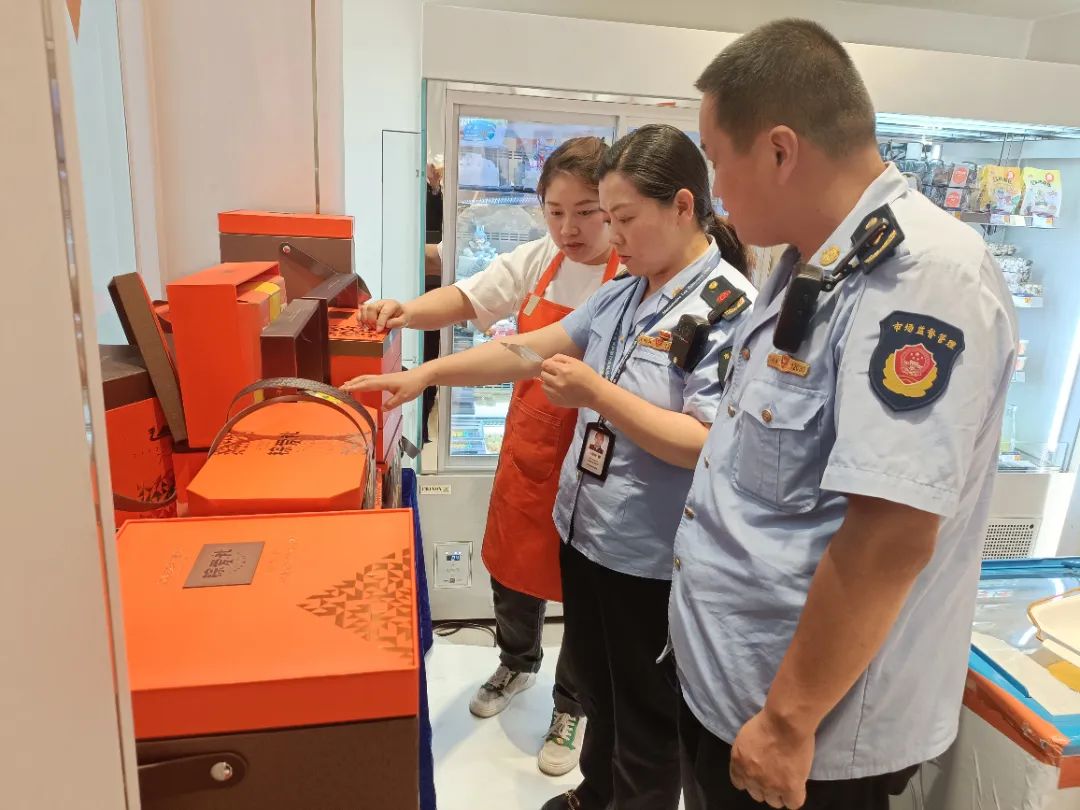 端午节前,市场监管执法人员对粽子专卖店内的粽子进行现场抽样检查。