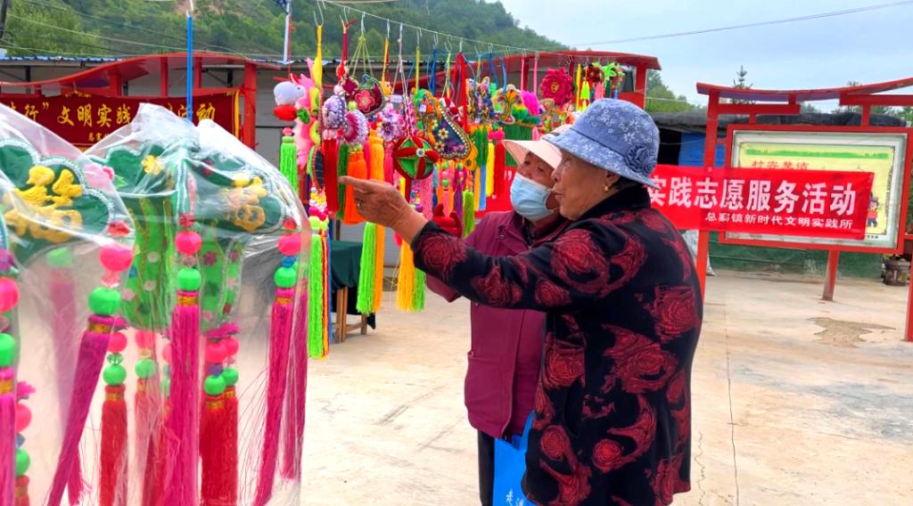 莫家沟村文化广场上展示着形态各异、五颜六色的香包。
