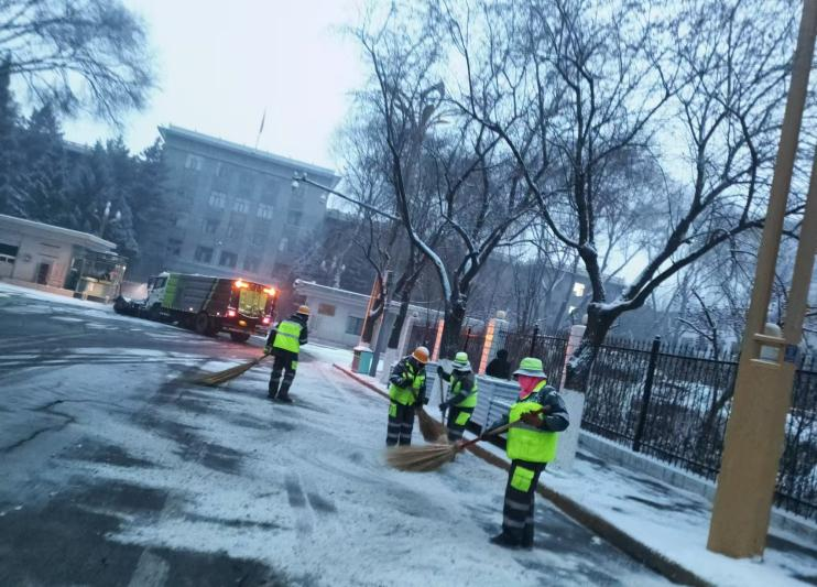 “闻雪即动”,全员上岗。全力保障城区道路畅通与市民出行安全。从早晨7点开始中心组织800余名一线干部职工开展扫雪除冰工作,除冰工作全面覆盖辖区人行道、政府部门、学校、医院、公交车站、广场、公园绿地等重点区域及公共场所。扫雪人员不畏严寒,认真清理每一处积雪,为市民开辟出安全便捷的出行通道。并在十字路口、公交港湾、坡道路面及人流量较大区域抛洒融雪剂12吨,及时排除道路安全隐患,全力打响扫雪除冰攻坚战。
