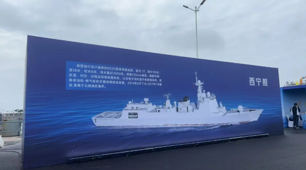 052D 型导弹驱逐舰西宁舰的介绍展板气势恢宏 —— 舰长 155 米、宽 18 米,搭载多型先进武器系统,作为我国自行设计建造的主力战舰,它是国防硬核实力的生动缩影。