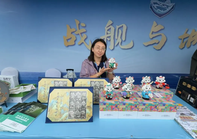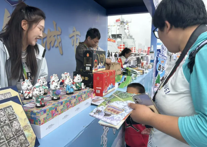 展台上,西宁带来的雪豹文创摆件萌趣十足:有的身着传统服饰、手持书卷,似在娓娓道来西宁的历史文脉;有的怀抱民族乐器,仿佛奏响城市与国防的 “协奏乐章”。还有精心设计的文化邮册,将西宁的人文景致与国防教育的厚重感巧妙融合。工作人员向市民讲述西宁与海军、与国防的故事时,大家捧着文创小物,目光里既有对 “萌系雪豹” 的喜爱,更有对 “国防守护家园” 的深刻共鸣 —— 国防力量的强大,与城市文化的繁荣,本就是同频共振的 “家国二重奏”。