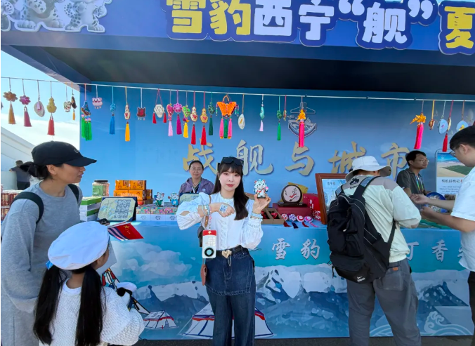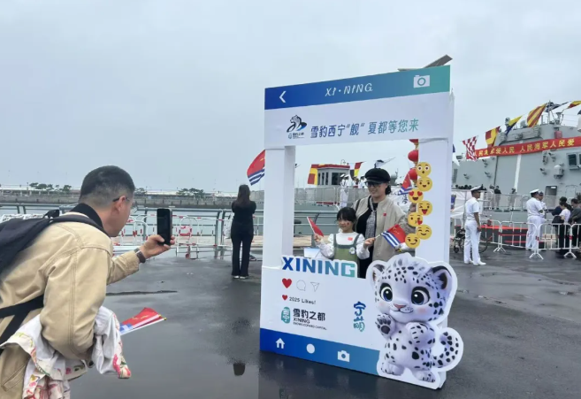 而在舰艇旁,西宁打造的 “文化小天地” 更添动:“雪豹西宁‘舰’ 夏都等您来” 的打卡框前,市民们纷纷驻足。大人与孩子手持小国旗,和西宁城市 IP “雪豹” 同框留影,海军舰艇的威武与雪豹的萌趣碰撞,定格下 “国防力量 + 城市文化” 的鲜活瞬间。