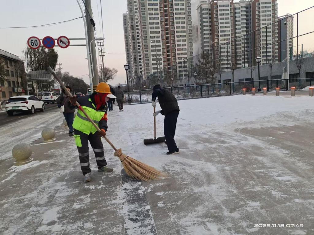 立冬初雪至,保障暖先行。2025年立冬后首场降雪如期而至,区市政中心秉持“以雪为令、闻雪而动”的工作理念,迅速启动冬季除雪防滑应急预案,800余名一线环卫工作人员全员上岗,对辖区主次干道、背街小巷、过街天桥、座地下通道及公厕周边扎实开展降雪清理工作,保障道路通行安全畅通,切实守护市民出行安全与城市环境整洁。