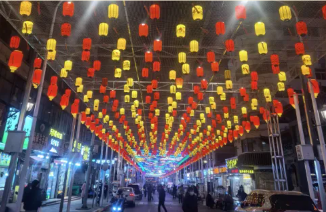 夜幕降临,莫家街的灯光依次亮起来。街口钢结构廊架上,定制的LED满天星灯与仿羊皮印花灯笼交相辉映,暖黄与亮白的光线交织成梦幻天幕。脚下的斑马线藏着巧思,雪豹造型与丁香花图案在灯光映照下格外鲜活,孩子们踮着脚追着光影跑,不少年轻人特意驻足拍照留念。