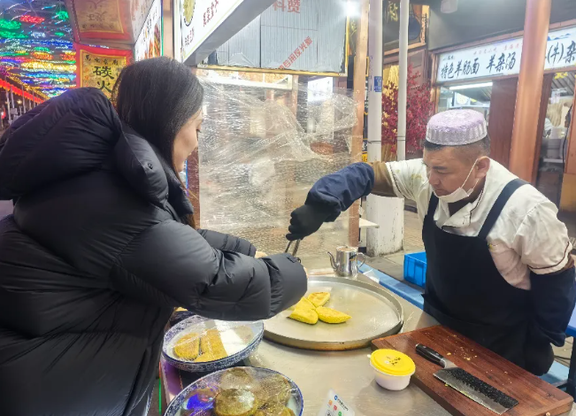 小吃摊的香气更诱人。在一家摊位前,市民正在购买“狗浇尿”和韭菜盒子。“莫家街现在好漂亮,虽然晚上很冷,但买点热气腾腾的小吃,边吃边逛,再拍些照片,就不那么冷了,还挺惬意。”市民于婷笑着说。