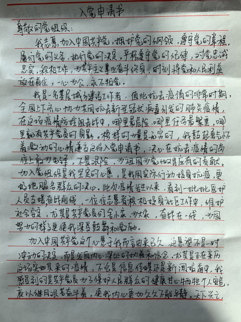 近日,杨发强向他所在单位的党支部郑重地递交了一份入党申请书。在这份特殊时期的入党申请书里,他写道:“我渴望成为党员这个优秀队伍中的一员,我将为这场疫情防控阻击战贡献力量。”一份入党申请书 ,一颗赤城向党心。杨发强只是建设系统众多志愿者的一个缩影,正因为有像他一样的志愿者,才有了小区一道道安全防线。
