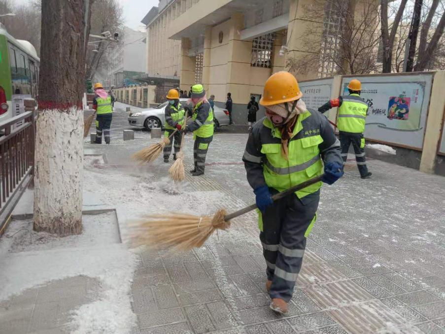 二是组织全体环卫人员对辖区医院、学校、商场、人行过街通道、劳动路、北门坡等人员出行较为频繁、人流量较为密集的路段进行清扫、抛洒融雪剂等,杜绝路面结冰等现象发生,保障行人及车辆通行安全。同时对所有市政基础设施及便民设施进行恢复,持续维护整洁舒适的城区环境。