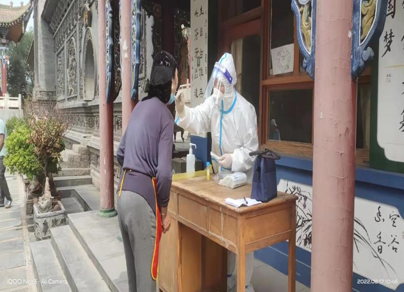 “敲门”上寺院,齐心协力共抗疫。按照应检尽检不漏一人的工作要求,我局始终坚持快字当头、分秒必争的信念,积极组织医务人员前往辖区法幢寺、宏觉寺、南山寺等6座寺院为200余名僧侣开展“敲门”核酸检测。在开展核酸检测工作的同时积极开展疫情防控知识宣传,引导广大宗教教职人员自觉配合、支持核酸检测工作,引导宗教教职人员科学佩戴口罩,加强室内外消杀毒、物品清洁消毒等工作,从日常点滴提升防控意识。