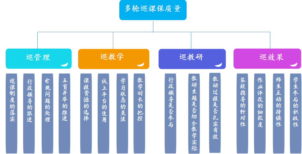 巡管理,让线上教学更规范。城中区教学研究室关注了各校线上巡课制度落实、行政领导跟进、出现问题整改、“五育并举”推进等方面的情况。经巡查,看到各校安排有序、分工明确,不同学校呈现出不同的线上教学管理风格。教研室及时将一些亮点特色在区内各校推广介绍。对发现的教学管理的一些问题,提出建设性意见建议,督促各校立即查漏补缺,取长补短。区属各校巡课反馈的针对性、导向性和有效性得到了进一步增强,实现了教研室巡管理促进学校行政领导对线上教学管理持续跟进的目标。