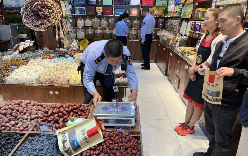 正值旅游旺季,为进一步保障民生计量领域量值准确,确保公平交易秩序,推动与人民群众日常生活密切相关的计量工作落地见效,6月27日,城中区市场监督管理局充分发挥计量监管作用,室所联动对辖区金店、农贸市场以及土特产店在用秤开展突击检查行动,切实维护广大人民群众合法权益,推动中区旅游事业高质量发展。
