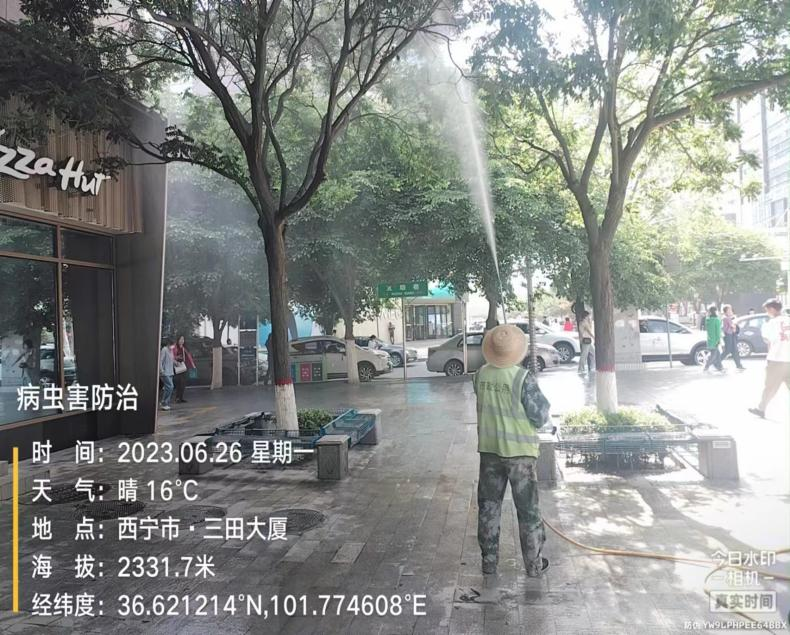 错峰打药,“防”出绿树浓荫。根据市园林局和森防站下发的病虫害防治相关工作要求,坚持“预防为主、防治结合”的原则,安排专人严密监测各监测点病虫害发生情况,做到“早发现、早预防、早根治”。与此同时,根据病虫害发生规律,按照“一树一档一方案”的工作原则,在不影响市民正常通行的前提下,采用物理防治与化学防治相结合的办法,对辖区绿化苗木病虫害进行错峰打药,有效提高了防治效果。此外,对个别树木根外追肥、施用生根剂、打营养针等方式,增强树木长势,提高抗病能力,保护树木健康成长。截至目前,出动85余人次,对辖区东、西大街、南关街、长江路、滨河路、七一路、北门坡、南川东路等22条道路,长青园、河湟公园、青唐城遗址公园、五一路小广场、园树小游园等7个公共游园累计打药35.5余吨,防治效果显著。