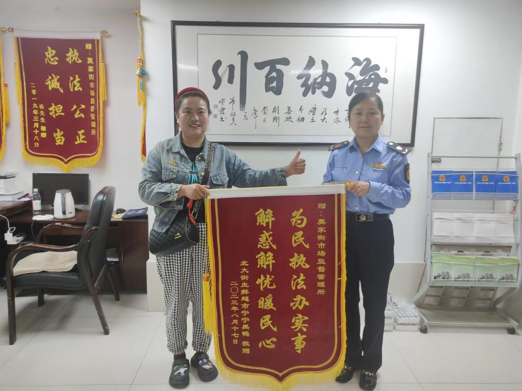 柔性执法有公正更有温度。“实在是太感谢您了!真的非常感谢!”伴随着连声道谢,一面写着“为民执法办实事,解惑解忧暖民心”的锦旗送到了莫家街市场监管所工作人员手中。在接到12345“食材不新鲜”的投诉转办单后,为慎重起见执法人员多次前往涉事店铺现场全面核查,最终认定该店证照齐全、索证索票齐全,所售商品保质期为3天,第2天进行促销,不存在食材不新鲜问题,为经营户澄清了事实,挽回了信誉。