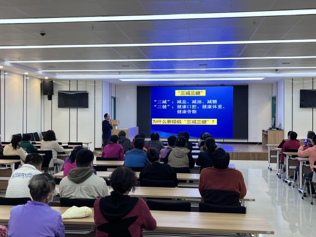 讲座现场,吴瑞琪讲师结合多媒体课件以盐、糖、油摄入过多的危害作为切入点,用生动贴切的语言向辖区居民详细讲解了什么是三减(减盐、减糖、减油)和三健(健康口腔、健康体重、健康骨骼),倡导“油半两、盐六克”的健康饮食观念,强调了减盐、减油、减糖的重要性。为到场的居民普及不健康的饮食、身体活动不足和吸烟是导致慢性病的重要行为危险因素,对于如何保持“三健”,提供了可行性的建议,呼吁居民在日常生活中养成减油、减盐、减糖的健康饮食习惯,经常参加各种体育锻炼以减少各种患病风险。以“日行一万步,吃动两平衡,健康一辈子”为主线,结合《中国居民平衡膳食宝塔》,为参加活动的辖区居民提供了健康食谱,强调合理膳食、适量运动、戒烟限酒,心理平衡等的重要性。