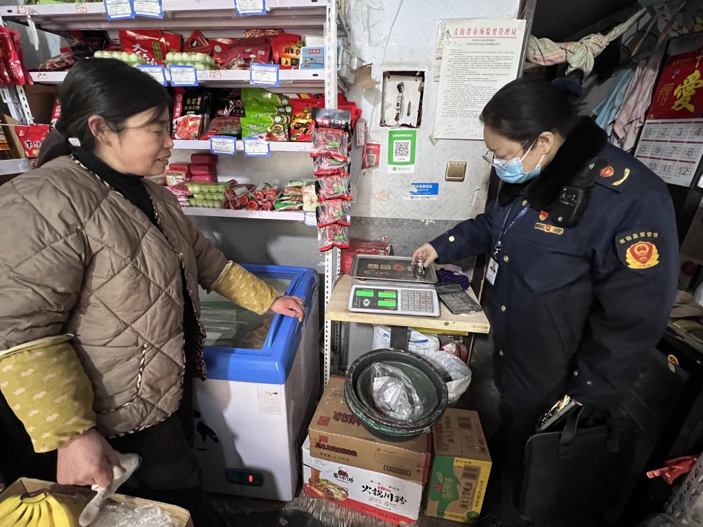 严查计量器具,确保消费公平。以散装食品、节日食品、海鲜类产品计量器具为重点,执法人员使用标准砝码对商超在用的电子计价秤逐一进行测试,检查电子计价秤是否存在缺斤少两、计量不准,是否张贴强制检定合格证标识且在有效期内等,对临近检定有效日期的电子计价秤使用商户进行提醒,要求商户准备报检,对未经检验检定的计量器具下达《责令改正通知书》,要求立行立改。