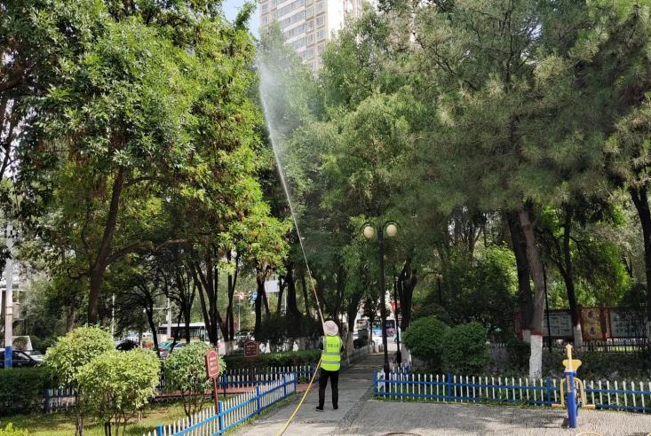 加强苗木病虫害防治,坚持“预防为主”相结合。夏季是病虫害的高发期,为做到树木病虫害早根治,及时控制虫害的生长和扩散,保障园林绿化植物机体健康。根据病虫害发生的种类、特点及规律,采取适时科学用药,组织管护人员对辖区内苗木进行喷药防治,有效抑制病虫害,保障绿化苗木健康生长。截至目前,青唐城遗址公园、中心广场、北门坡等游园、广场、街道累计药物喷洒65余吨。同时加强巡查力度,确保及时、有效控制雨后病虫害发生,提高市民绿色“幸福感”。