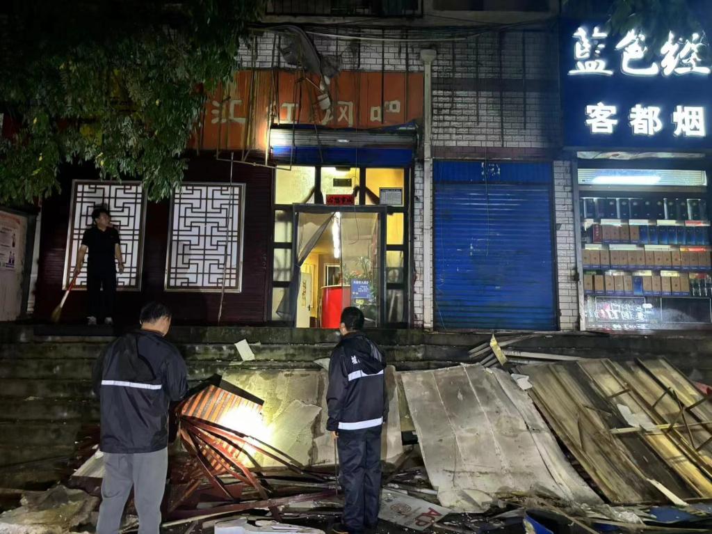 凌晨时分,区城管局人民街中队队员在排查安全隐患问题时,发现一家名为“茶余饭逅”茶艺馆和临近服装店的门头牌匾掉落在地上,城管队员第一时间上前查看有无人员伤亡,发现无人受伤后马上将破损的门头移动至人行道边,保障此路段的正常通行。后经核查发现,该店门头牌匾的主要材质为石膏板,由于夜晚雨势较大,石膏板吸水后重量增加,加之大风天气与旁边服装店门头一同掉落。待天亮之后,为保证行人的正常通行,城管队员积极联系相关人员将破损门头进行清理拉运,继续开展下一轮巡查工作。