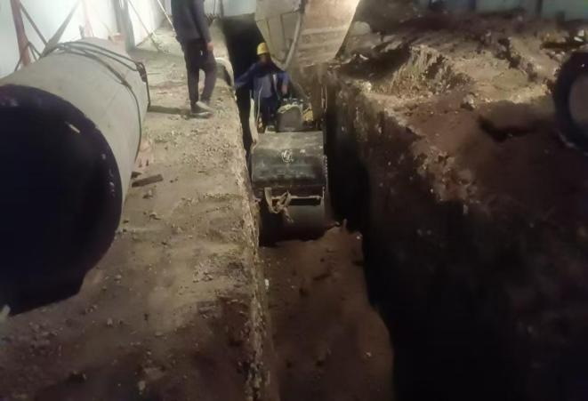 夜幕低垂,万籁俱静,城市渐渐沉睡,然而在城中区奉青路雨水管网改造项目施工现场却仍是一片热火朝天的景象,作业机械不停地挥舞着铁臂,工人们正有序进行着基坑回填夯实工作。