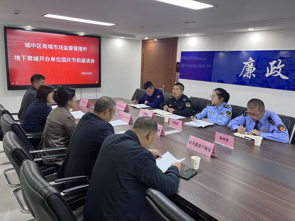 在国庆佳节即将来临之际,为认真贯彻落实省、市、区关于安全生产工作部署要求,确保节日期间地下商城安全稳定。近日,城中区商城市场监督管理所组织5家地下商城开办单位负责人召开安全生产座谈会。