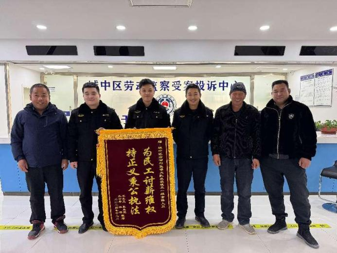 近日,18名被拖欠工资的劳动者将一面印有“为民工讨薪维权,持正义秉公执法”的锦旗送到城中区城市管理局劳动保障监察中队,对工作人员帮助他们解决烦“薪”事,表示感谢。