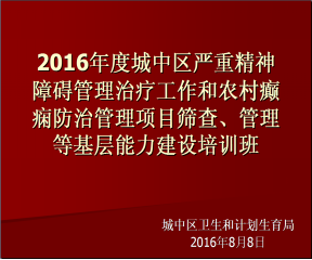 根据西宁市卫生和计划生育委员会关于印发《2016年度西宁市严重精神障碍管理治疗工作和农村癫痫防治管理项目筛查、管理等基层能力建设培训班的通知》文件要求,为认真做好全区2016年度严重精神障碍患者管理治疗工作,我局于8月8日-9日积极联系青海省第三人民医院专家,组织区残联、区妇联、区公安分局及各居委会干部(村干部)和下属基层医疗机构的负责人(个案管理员)约140余人,在区食药局会议室举办了2016年度城中区严重精神障碍管理治疗工作和农村癫痫防治管理项目筛查、管理等基层能力建设培训班。