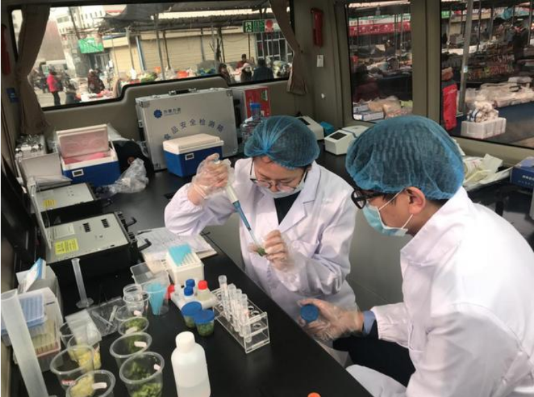 工作人员在总寨镇新庄农贸市场内3家摊位随机抽取小油菜、生菜、白菜等9个批次产品,并使用食品安全快速检测车内便携式一体化检测仪对抽检蔬菜进行有机氯和氨基甲酸酯等农残指标的测定,经快速检测,以上9各批次产品全部合格。