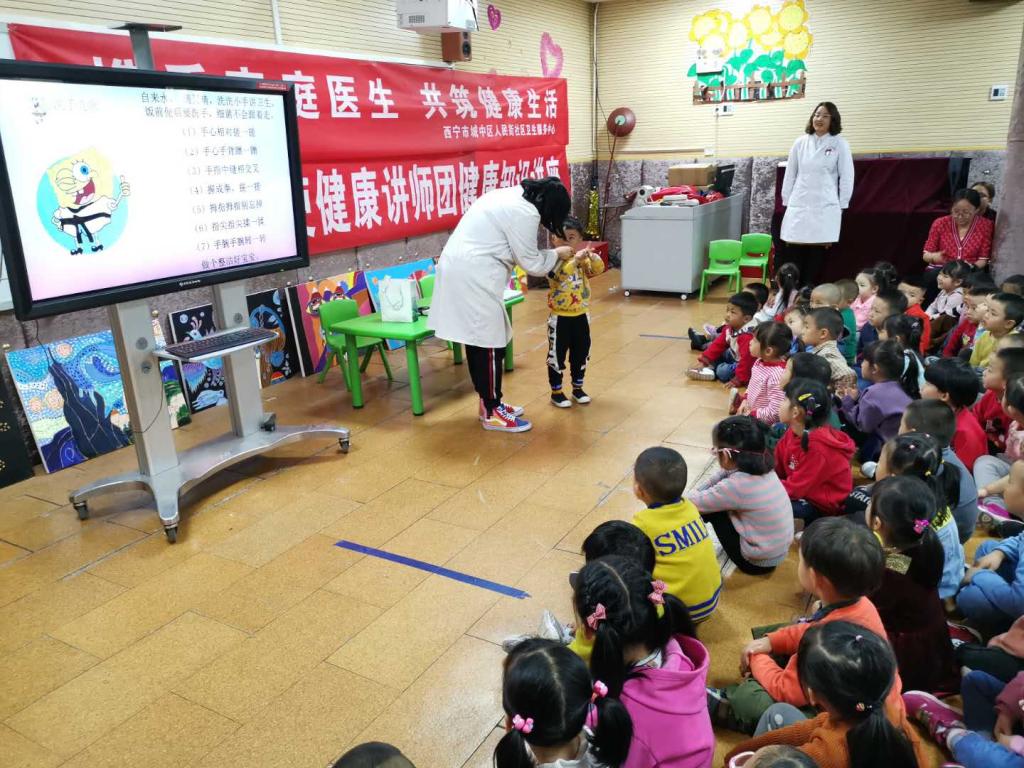 活动现场,人民街社区卫生服务中心的全科医师团队为在校师生送去了一堂生动的碘缺乏病防治知识课,精心制作的多媒体动画课件,激发了孩子们的好奇心,让孩子们在轻松、愉快的气氛中了解碘缺乏的危害、缺碘的原因及碘缺乏病的表现。饮马街社区卫生服务站的师素琴医生给师生们教唱洗手歌并演示正确的七步洗手法,提醒小朋友们要养成饭前便后勤洗手的良好习惯。