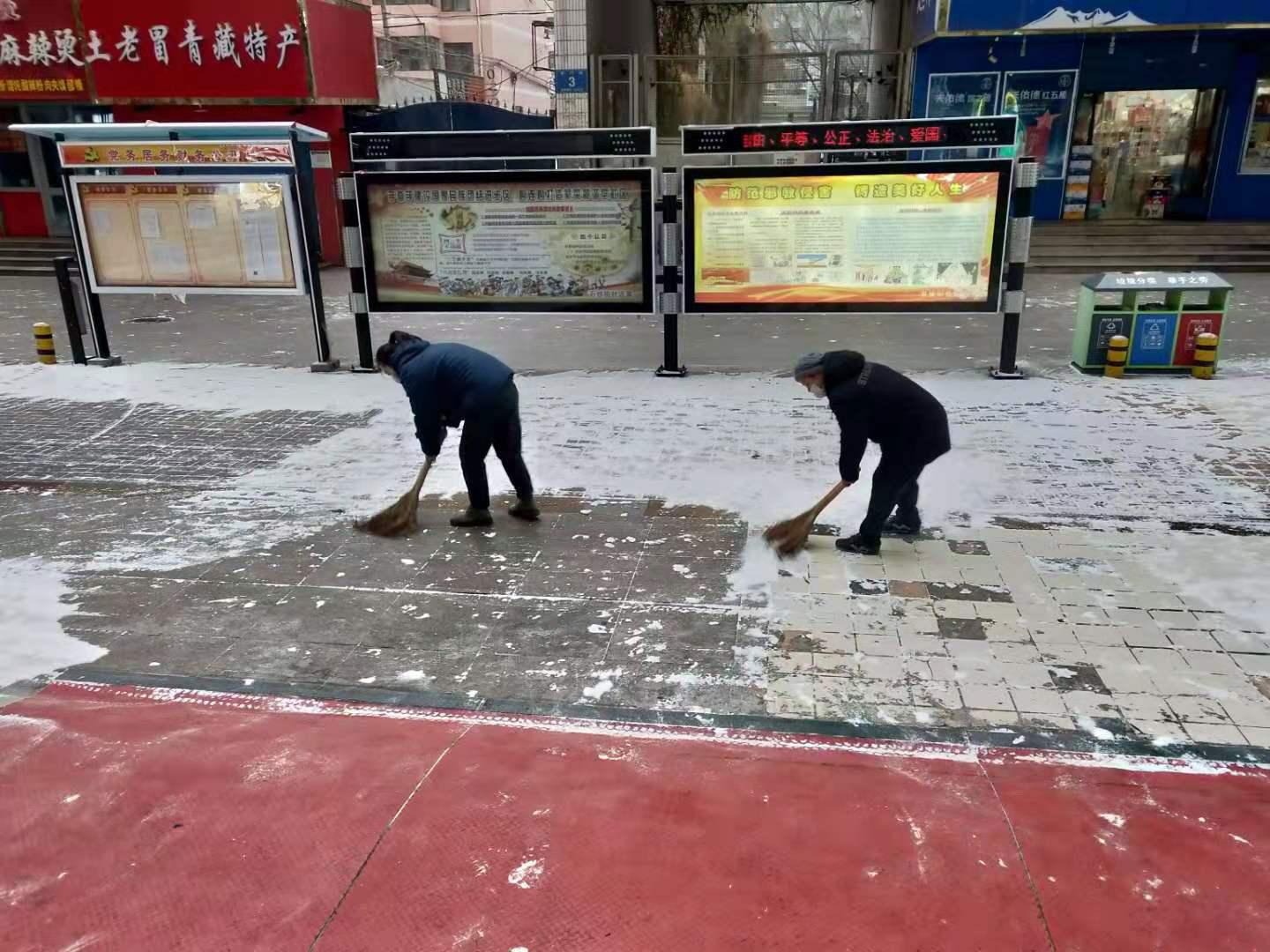 在督促商户的同时,各责任街长也加入扫雪的队伍中,以身作则,拿起铁锹和扫帚,齐心协力清扫积雪和冰块,大家不惧严寒,团结协作,冷冽的寒风把脸冻得通红,但丝毫没有影响大家扫雪的热情和效率,大家的身影在皑皑白雪中呈现出一道美丽风景,得到了路过群众的纷纷点赞。