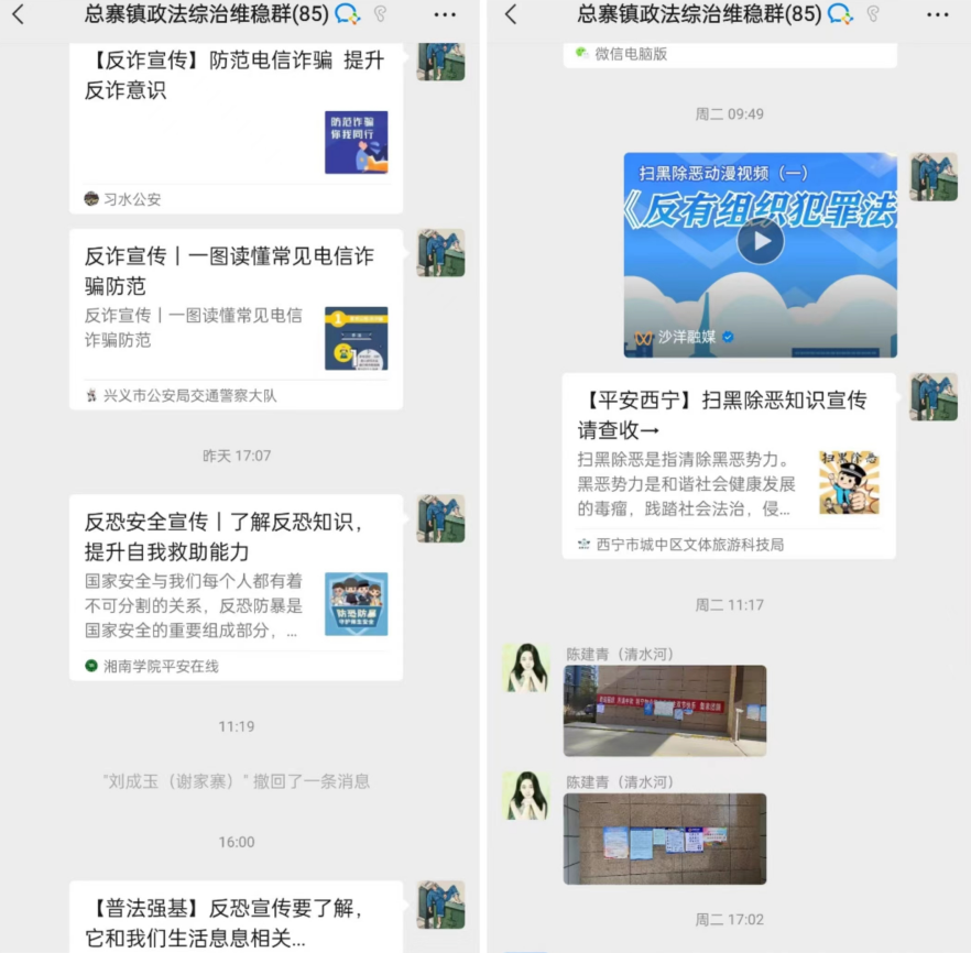 线上宣传广覆盖、更便捷。广泛动员广大职工和辖区群众在“中国禁毒”公众号平台积极参与“禁毒我承诺”活动,阅读学习禁毒知识及案例,积极在工作群中转发反电诈、反恐怖、扫黑除恶等方面的知识链接、宣传小视频等,提高辖区群众对平安建设的知晓度和参与度,切实扩大宣传覆盖面。