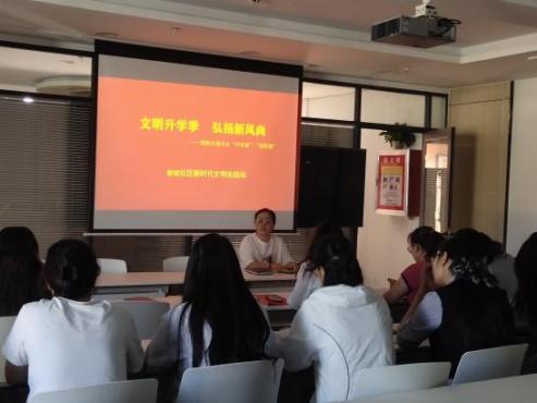 文明升学季,弘扬新风尚。新城社区新时代文明实践站依托道德讲堂开展抵制铺张浪费、大操大办“升学宴”“谢师宴”宣传活动,工作人员用通俗易懂的语言向大家讲解大操大办、盲目攀比带来的危害,引导辖区群众用文明、节俭的方式与亲朋好友分享金榜题名的喜悦。线上通过邻里牵手群、朋友圈转发操办“升学宴”,切记有“红线”相关链接,引导辖区居民摒弃不良风气,树立文明健康的生活理念。