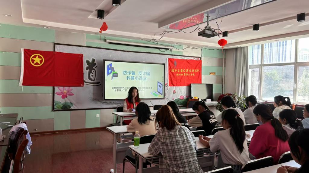 青春启航,开启反诈小课堂。“毛某玩手机游戏时,打开‘低价出售游戏装备’的弹窗,结果被冒充客服人员诱导转账上千元人民币,被拉黑后才意识到被骗,大家可别成为被骗‘显眼包’哦!”总寨镇工作人员通过诙谐幽默、通俗易懂的语言带领孩子们一起了解什么是电信诈骗,电信诈骗的套路、如何识别电信诈骗以及上当后的补救措施等,结合生活中的真实案例,如虚假中奖、冒充熟人、免费充值链接、电话手表诈骗等,并播放“反诈防诈”宣传动画视频,让孩子们进一步了解电信诈骗的特点,不要轻易透漏个人信息,遇到可疑情况要及时向家长、老师或警察求助,不断提高自身防范能力。