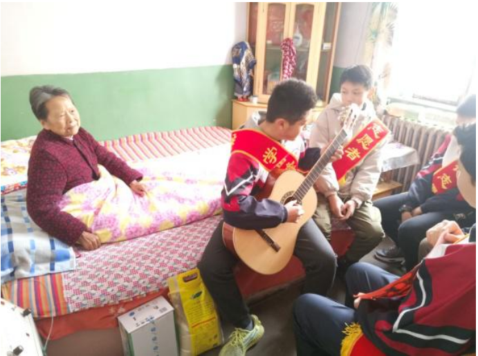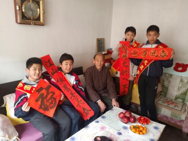 南川西路福禄巷5号院杨欣爱老人已有八十岁高龄,早年因腿部残疾瘫痪再床,老伴一直无微不至的照顾她,现有因年事已高,眼睛也看不清楚,平时儿女们忙于上班,没有时间经常陪伴老人。当天早上青少年志愿者前往老人的家中进行慰问,为老人献上春节祝福。青少年志愿者帮助老人打扫卫生。志愿者们认真、耐心地听老人家讲述难忘的人生经历,老年人的事迹让志愿者们为之感动,志愿者有感而发的为老人献唱一首《感恩的心》。活动最后志愿者们将自己亲手书写的春联交到了老人手中。