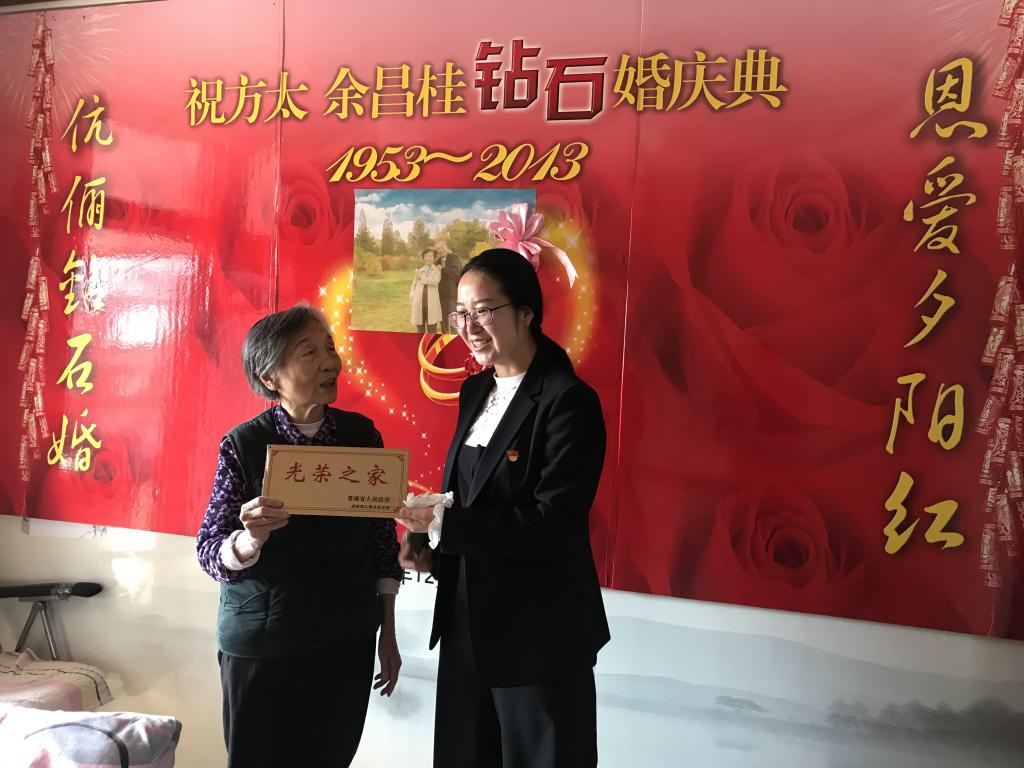 “谢谢你们,谢谢党和政府对我们这些老兵的关怀,还特地将光荣牌送过来。”家住东大街社区的退伍军人于师傅拿着光荣牌十分激动。看着眼前的“光荣之家”荣誉牌,于师傅不禁回想起那段青春岁月:“18岁走进军营,一晃就过了近半个世纪了,国家和政府一直关心惦念着我们,前两年,我因身患直肠癌,导致家庭生活贫困,社区工作人员了解这一情况后,及时把党的惠民政策送到家,为我申请了低保,解决了我的生活和看病问题,......。”随后,社区工作人员把小小金属牌安装在老人家大门上。凝聚着深深拥军情,四周红色花边,正中是一个红色的五角星,加上“光荣人家”四个字,显得庄严而神圣。
