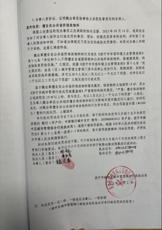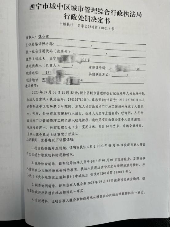 西宁市城中区城市管理综合行政执法局行政处罚决定书 中城执法罚字[2023]第(8001)号