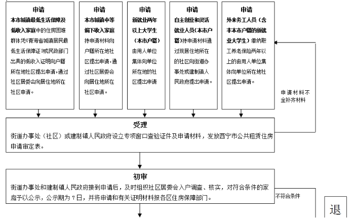 本市城镇最低生活保障及低收入家庭中的住房困难群体凭《青海省城镇居民最低生活保障证》或民政部门出具的低收入证明向户籍所在地社区提出申请,通过社区居委会向居住地所在社区申请。本市城镇中等偏下收入家庭持申请材料向户籍所在地社区提出申请,通过社区居委会向居住地所在社区申请。新就业两年以上大学生(本市户籍)由用人单位集体向单位所在地的社区提出申请自主创业和灵活就业人员(本市户籍)持申请材料通过现居住地所在的社区向街道办事处或建制镇人民政府提出申请。外来务工人员(含非本市户籍的新就业大学生)缴纳职工养老保险两年以上的由用人单位集体向单位所在地社区提出申请。具备的条件:1.户籍条件:申请人及共同申请的家庭成员具有当地城镇常驻户口 ,并在当地居住或工作。2.收入条件:申请人 家庭人均收入和家庭财产符合当地人民政府规定的标准。3.住房条件:申请人及共同申请的家庭成员无私有产权住房,或私有产权住房人均建筑面积低于当地人民政府公布的住房困难标准;享受其他住房保障政策。4.新就业职工和外来务工人员条件新就业职工:具有当地城镇常驻户口,已于用人单位签订劳动聘用合同。外来务工人员: 持有就业地城镇居住证或暂住证,已于用人单位签订劳动聘用合同 在申请地连续缴纳社会保险1年或以上,累计缴纳社会保险2年以上 |