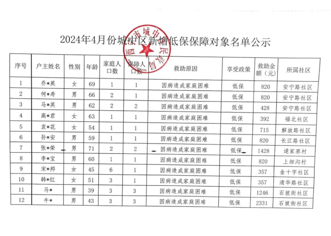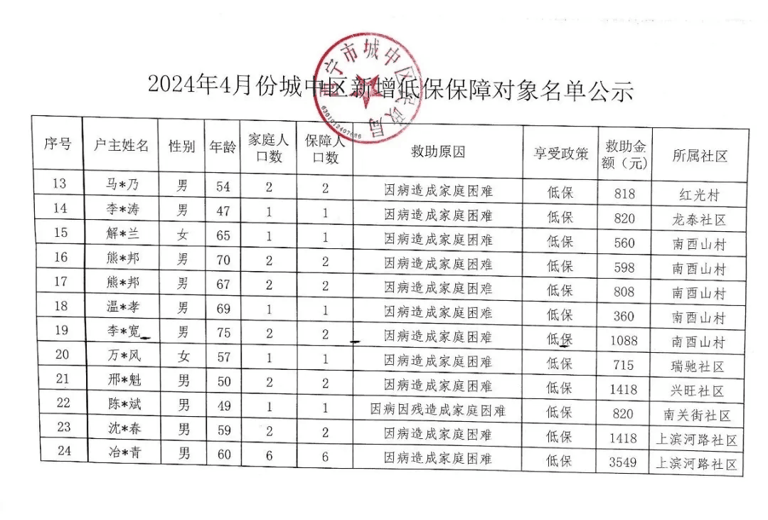 2024年4月城中区新增低保保障对象名单公示
