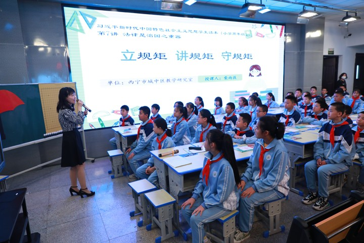 展示—精彩演绎,沉浸实境大课堂。思政课是落实立德树人根本任务的关键课程,思政课堂是推进中小学思政课一体化教学的主阵地。西宁市第十一中学教师马丽娜、城中区教学研究室教研员柴雨孜围绕“法律学习”主题,分别展示了中学课例《生活需要法律》、小学高年级课例《立规矩讲规矩守规矩》。课堂上,师生亲切互动,现场气氛热烈,与会人员享受了两节生动的思政课。教学展示环节以教师跨学段听课,跨层次协作,实现不同学段思政课互联互通,有效衔接,达到“启蒙道德情感、打牢思想基础、提升政治素养、增强使命担当”的教学目标,既“守好一段渠”,又“跑好接力赛”。
