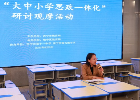 为深入学习贯彻党的二十大精神,贯彻落实习近平总书记在学校思想政治理论课教师座谈会上的重要讲话精神和在二十届中共中央政治局第五次集体学习时的重要讲话精神,加强对不同学段思政课建设统筹指导,切实发挥思政课立德树人根本任务的关键作用,全面增强思政育人效果。近日,由西宁市教育局主办、城中区教育局承办的“西宁市大中小学思政一体化研讨观摩活动”在西宁市南大街小学举行。西宁市教育局相关领导、市属学校校长和教师代表、西宁市各区县教研室负责人及思政教师、城中区区属学校副校长及思政教师等150余人参加活动。