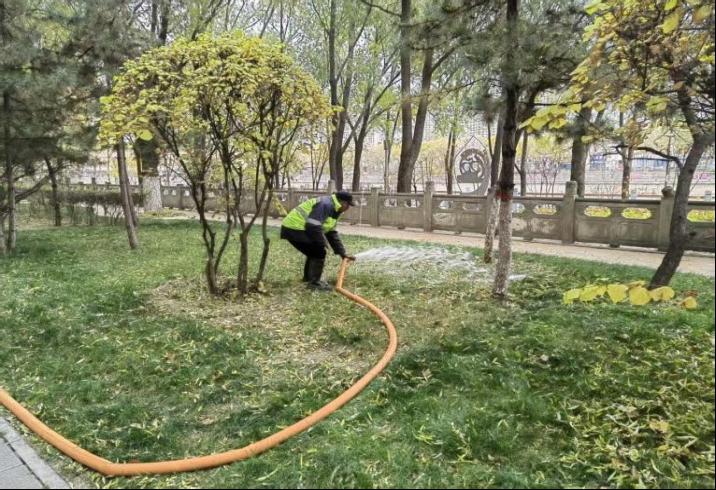 全面漫灌,助力植物安全过冬。为确保绿化植被安全越冬,区市政中心全面启动冬季绿地冬灌作业。一是采取“水车低速巡浇+人工定点补灌”的作业模式,扩大灌溉覆盖面,保障水分能够充分下渗至土壤深层,有效为植物根系形成冬季“保温层”。作业过程中,结合季节气候及城市道路情况,合理安排人员对城区绿地实施精准浇灌,严格把控水流速度与浇灌时长,防止出现积水或灌溉不均匀现象。二是针对车流量较多的道路,工作人员主动避开交通高峰,利用夜间时段对苗木进行灌溉。截至目前,每日安排养护人员10名、调配水车7辆,对滨河路、南京路、绿景园等街道及公园游园累计浇灌2.5万平方米。