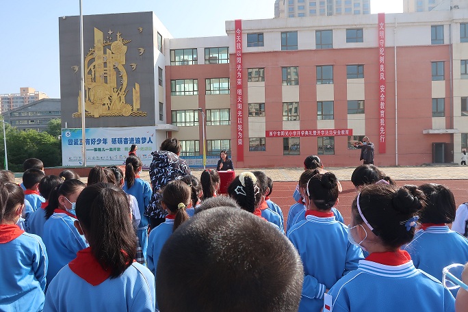 操场上,学生们排着整齐的队列认真聆听法治讲解,让学法、知法、用法的良好氛围萦绕在开学第一天的学校操场上。在这节课中,她首先从我们国家对于未成年人犯罪的法律法规有哪些入手,引导学生们了解并不是未满14周岁的未成年人就可以为所欲为、无所拘束了,日常生活中的习惯足以影响人的一生,一定要养成良好的习惯,然后从六个方面将学生中常见的一些不良习惯结合未成年人中常见的几种犯罪行为进行介绍,提醒未成年人克服日常生活中的不良行为,教育学生们学会自我保护,用法律保护自己的合法权益,促使未成年人健康快乐的地学习和生活。