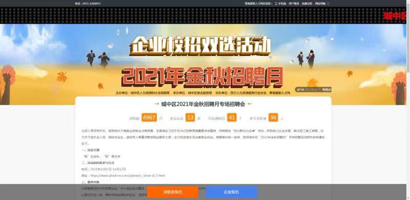 为进一步促进高校毕业生、农民工、退役军人等重点群体就业创业,结合党史学习教育“我为群众办实事”实践活动,2021年10月25日至11月21日,城中区就业服务局深入开展线上大中城市联合招聘高校毕业生秋季专场活动、金秋招聘月活动和人力资源市场高校毕业生就业服务周活动。