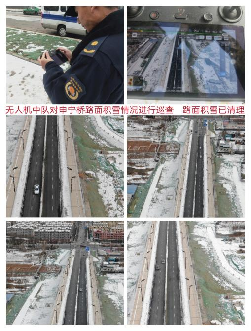 这是城中区城管局首次使用无人机查看雪情,加强对主次道路、桥梁等重点区域、重点部位的低温冰冻监测,重点采集降雪天气高发事件(包括路面结冰、桥面结冰、绿化树损坏、管线损坏等),及时汇报有关部门第一时间处置,为及时调整除雪保畅方案提供了科学依据,最大限度避免和减少低温雨雪冰冻天气带来的不利影响。近日,无人机巡查时发现城中区申宁桥、郁金香大街人行道有明显积雪,影响过往车辆通行,工作人员立即与南管委沟通,对积雪进行有效清理,保障道路安全畅通。